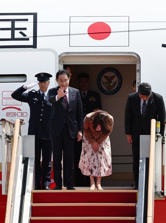 1박2일간의 짧은 실무방한 일정을 마친 기시다 후미오 일본 총리가 8일 경기 성남 서울공항에서 전용기에 올라 손을 흔들고 있다. 연합뉴스 |