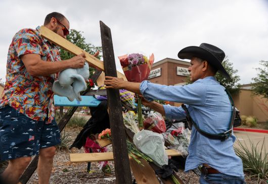 7일(현지시간) 미국 텍사스주 댈러스 앨런의 프리미엄 아울렛 매장 입구에서 주민들이 전날 발생한 총기 난사 사건 희생자들을 위해 십자가를 세우고 있다. 지난 6일 쇼핑몰에서 총기 사고가 발생해 용의자 포함해 최소 9명이 숨졌다. [연합] |