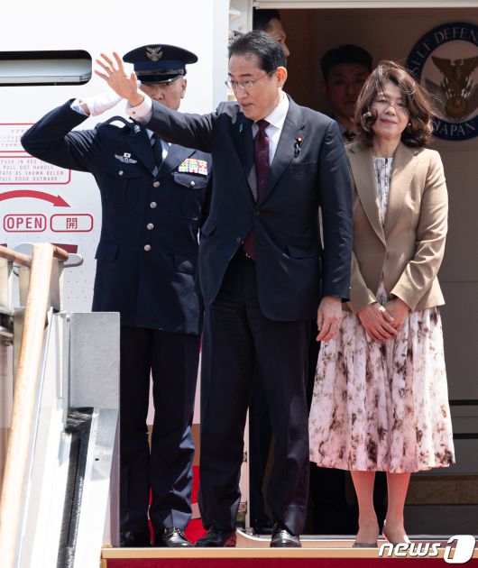 기시다 후미오 일본 총리가 8일 경기도 성남시 서울공항에서 출국하기 전 인사하고 있다. 2023.5.8/뉴스1 ⓒ News1 이재명 기자 |