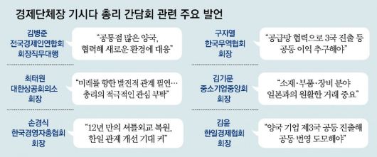 8일 서울 중구 롯데호텔에서 주한일본대사관 주최로 열린 간담회는 오전 10시 10분부터 약 45분간 비공개로 진행됐다. 참석자들에 따르면 경제단체장들이 각 단체 활동 소개와 건의 사항, 경제 협력 추진 방안 등을 이야기하는 비교적 편한 분위기의 티타임 형식으로 진행됐다. 김병준 전국경제인연합회 회장직무대행, 최태원 대한상공회의소 회장, 손경식 한국경영자총협회 회장, 구자열 한국무역협회 회장, 김기문 중소기업중앙회 회장, 최진식 한국중견기업연합회 회장 등 경제6단체장과 김윤 한일경제협회 회장이 참석했다.