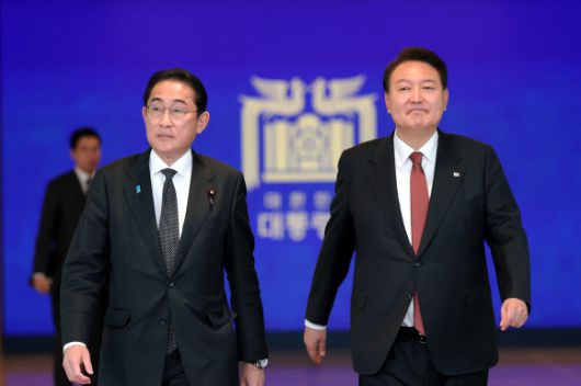 윤석열 대통령(오른쪽)과 1박2일 일정으로 한국을 찾은 기시다 후미오 일본 총리가 7일 서울 용산 대통령실 청사에서 공동 기자회견을 마친 뒤 나란히 걷고 있다. 연합뉴스 |