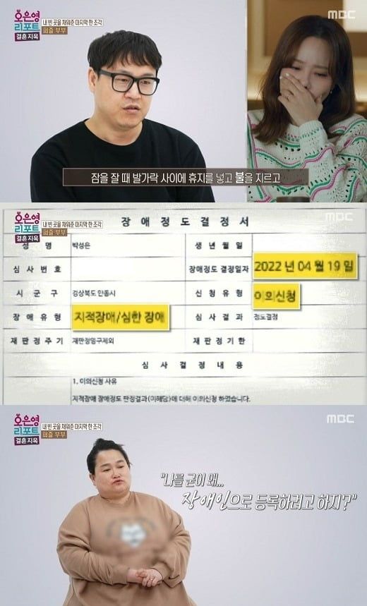 이에 오은영 박사는 "남편이 혜택 받으려고 아내를 장애인 등록한 거 아니냐고 생각할 수 있다. 지적 장애 등록증이 있다고 해서 없었던 거에 비해 어마어마한 혜택이 있지 않다"고 말했다. 이어 "최소한의 제도적 보호를 하기 위한 복지 시작이라 보면 된다"고 바로잡았다.