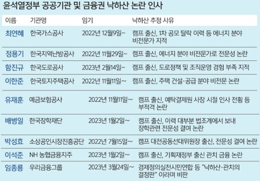 대표적으로 지난해 12월 임명된 최연혜 한국가스공사 사장의 경우 한국철도공사 사장을 역임한 경력이 있지만 에너지 분야 전문성이 없어 논란이 일었다. 최 사장은 1차 공모 면접 심사에서 에너지 관련 이해도가 부족하다는 이유로 탈락했지만 재공모 끝에 사장이 됐다. 최 사장은 지난 대선 당시 윤석열 후보 캠프의 정책자문단 총괄간사를 지냈다. 지난 2월 한국도로공사 사장에 임명된 함진규 전 의원도 낙하산 인사 논란이 제기됐다. 윤석열 대선 후보 예비 캠프의 수도권 대책본부장을 맡았던 함 사장은 국회의원 시절 국회 국토교통위에서 활동한 것을 제외하면 관련 분야 이력을 찾아볼 수 없다.