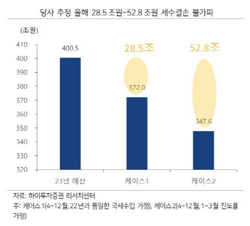 김 연구원은 “최악의 경우 1분기까지의 국세 흐름(진도율 21.7% 적용)이 남은 기간 내내 지속한다면(연간 진도율 86.8% 달성) 국세는 예산 대비 52조8000억원 줄어들 수 있다”며 “2~3분기 세수진도율이 이례적으로 증가하지 않는 이상 올해 세수결손은 불가피할 것”이라고 전망했다.