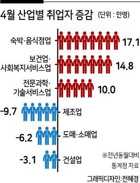 반면 거리두기 해제로 여행 등 야외 활동이 증가하면서 숙박·음식점업 취업자는 17만1000명 늘어 산업별로 볼 때 최대 증가폭을 기록했다. 정부의 직접일자리와 돌봄 서비스 증가 등으로 보건복지업 취업자도 14만8000명 늘었고, 전문과학및기술서비스업은 10만명이 늘었다.