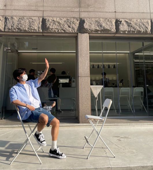 사진 속 임영웅은 카페 야외 좌석에 앉아 정면에서 내리쬐는 태양빛을 마주하고 있다. 강렬한 햇살에 찡그린 눈이 엿보인다.
