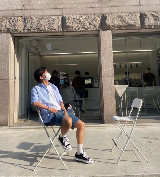 하늘빛 반팔 셔츠와 흰 티셔츠, 청반바지에 컨버스를 매치한 임영웅은 소년미가 돋보이는 청량한 남친룩으로 눈길을 사로잡는다.