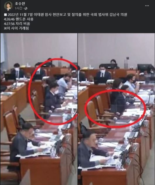 같은당 조수진 의원도 12일 개인 SNS에 해당 회의 중계화면 캡쳐 사진을 올렸다. 김 의원이 스마트폰을 바라보다가 자리를 뜬 모습이다.