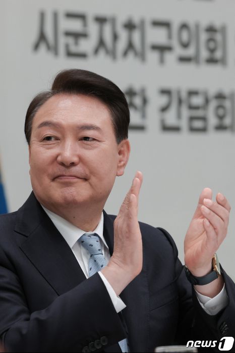 윤석열 대통령이 12일 청와대 영빈관에서 열린 시군자치구의회의장 오찬 간담회에서 박수치고 있다. (대통령실 제공) /사진=뉴스1 |
