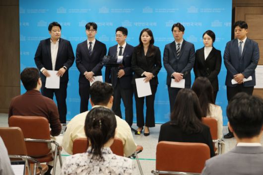당 쇄신 촉구 나선 민주당 청년 정치인들 - 더불어민주당 이동학 전 최고위원과 박성민 전 최고위원 등 청년 정치인들이 12일 오전 국회 소통관에서 기자회견을 열고 당 쇄신을 촉구한 뒤 취재진의 질문에 답하고 있다. |