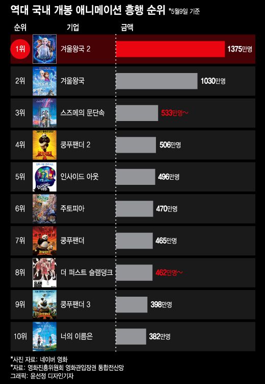 애니메이션 흥행 5위와 6위는 각각 디즈니·픽사의 '인사이드 아웃', 디즈니의 '주토피아'가 차지했다. '쿵푸팬더' 시리즈는 7위에 '쿵푸팬더', 9위에 '쿵푸팬더 3'이 오르며 막강한 국내 팬덤을 짐작게 했다.