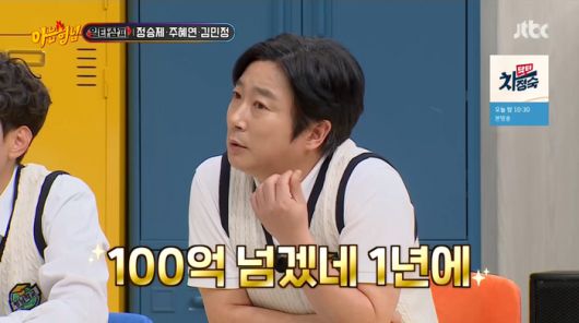 이수근은 “그럼 100억 넘겠네”라고 짚었다. 정승제의 반응에 형님들은 “100억보다 위냐 아래냐”라고 물었다. 정승제는 “그것보다는 위”라고 솔직히 밝혀 놀라움을 안겼다.