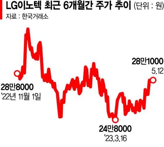 14일 한국거래소에 따르면 LG이노텍의 주가는 27만원을 기준으로 등락을 거듭하고 있다. 지난 2월 20일 장중 29만6000원까지 오르며 30만원을 눈앞에 뒀으나 이내 하락세로 돌아섰고, 3월 16일 장중 24만8000원으로 52주 최저가를 기록했다. 지난달 초 이후 약 6% 상승하며 꿈틀대는 모습이지만 아직은 지켜봐야 한다는 것이 중론이다.