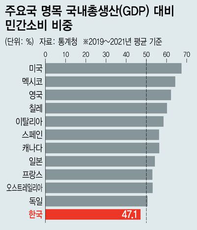 코로나19 전후(2019∼2021년)로 국내총생산에서 민간최종소비지출이 차지하는 비중을 보면 한국은 47.1%로 다른 국가들에 비해 현저하게 수치가 낮다. 한국과 마찬가지로 수출 지향적 국가일 것으로 보이는 일본은 54.2%, 전체 경제에서 소비가 3분의 2 이상을 차지한다고 알려진 미국은 67.4%를 기록했다. 유럽의 경우 영국과 프랑스의 민간소비 비중이 각각 62.2%, 53.4%에 달했고, 그나마 유로존 내에서 수출 의존도가 높은 독일도 소비 비중은 50.6%였다.