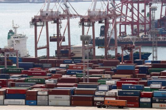 부산항 신선대부두에서 수출 컨테이너 화물이 선박에 실리고 있다. 연합뉴스. |