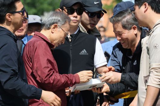 이명박 전 대통령이 15일 서울 청계천에서 옛 참모들과 함께 산책하기에 앞서 청계광장에서 지지자들에게 자필 서명을 해주고 있다. 사진=서동일 기자 |