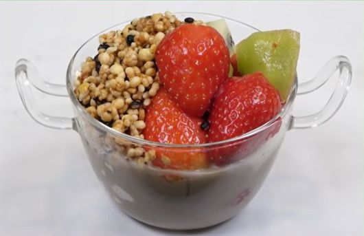 요리법은 이렇다. 약콩이나 병아리콩 같은 콩 종류는 따로 갈아서 밀폐 용기에 보관한다. 그리고 종이컵 3분의 1 또는 2분의 1컵 분량의 통곡물과 콩을 그릇에 담고 귀리우유를 부어 10분 정도 불려둔다. 그 사이 딸기, 블루베리, 파프리카 등 제철 과일과 채소를 씻은 뒤 그릇에 담는다. 여기에 당 첨가가 안 된 그릭요거트나 두유요커트를 부어주면 끝이다.