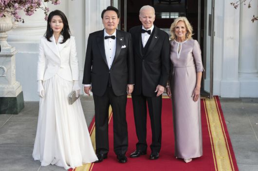 지난달 26일(현지시각) 미국을 국빈 방문한 윤석열 대통령과 김건희 여사가 워싱턴 디시(DC) 백악관에서 열린 국빈만찬에 참석해 조 바이든 미국 대통령과 질 바이든 여사와 기념촬영을 하고 있다. 연합뉴스 |