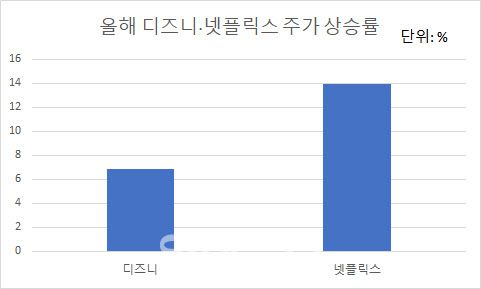 다만 올해 들어 90~100 달러 박스권을 그리는 디즈니 주가와 달리 넷플릭스 주가는 290달러서 360달러까지 급등한 후 잠시 숨 고르기를 보이고 있다. 지난해 말 종가 기준 넷플릭스 주가는 14% 오른 반면 디즈니 주가는 6.8% 상승에 그쳤다.