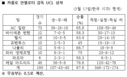 안첼로티 감독은 유벤투스를 이끌고 UCL에 첫선을 보인 이래 8개 팀에서 지휘봉을 잡고 기록을 축적해 왔다. 이 가운데 AC 밀란과 레알 마드리드에서 많은 경기를 치르고 승수를 쌓으며 각각 두 번씩 정상을 정복했다. 2002-2003·2006-2007시즌 개선가를 부른 AC 밀란에서 73경기를 치러 39승을 올렸고, 2013-2014·2021-2022시즌 대풍가를 부른 레알 마드리드에선 49경기를 지휘해 36승을 챙겼다. 레알 마드리드에선 최고 승률(78.6%)까지 올렸다(표 참조).