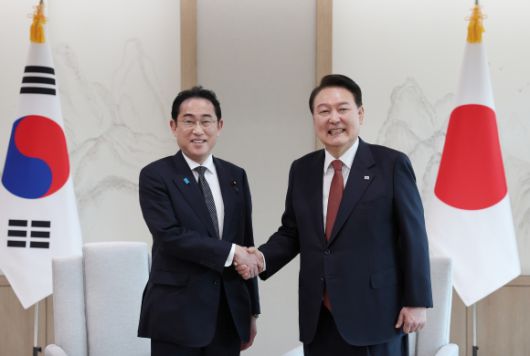 악수하는 한일 정상 - 윤석열 대통령과 기시다 후미오 일본 총리가 7일 서울 용산 대통령실 청사에서 열린 한일 정상 소인수 회담에서 악수하고 있다. 대통령실 제공 |