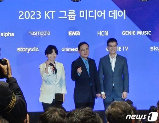 KT는 18일 KT스튜디오지니 및 ENA와 서울 동대문구 노보텔에서 'KT그룹 미디어데이'를 개최했다. 사진은 행사에 참석한 강국현 KT커스터머부문장(중간), 김철연 KT스튜디오지니 대표(왼쪽), 윤용필 ENA 대표(오른쪽) 2023.5.18/뉴스1 ⓒ News1 윤지원 기자 |