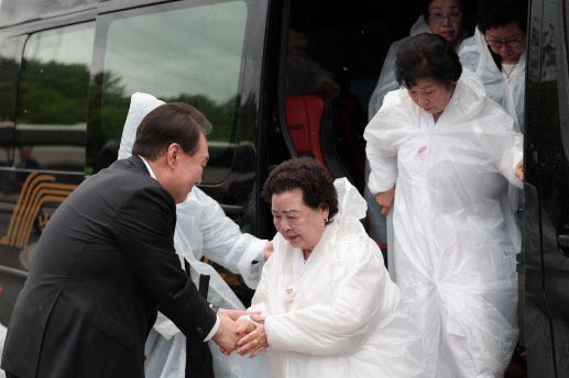 윤석열 대통령이 18일 광주 북구 국립5·18민주묘지에서 열린 제43주년 5·18민주화운동 기념식에 앞서 오월어머니회 회원들과 인사하고 있다. (사진=연합뉴스) |
