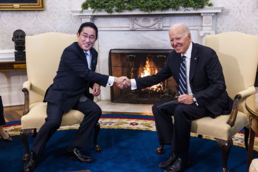 백악관에서 악수하는 기시다 후미오 일본 총리와 조 바이든 미국 대통령. 2023.01.13 [사진=블룸버그] |