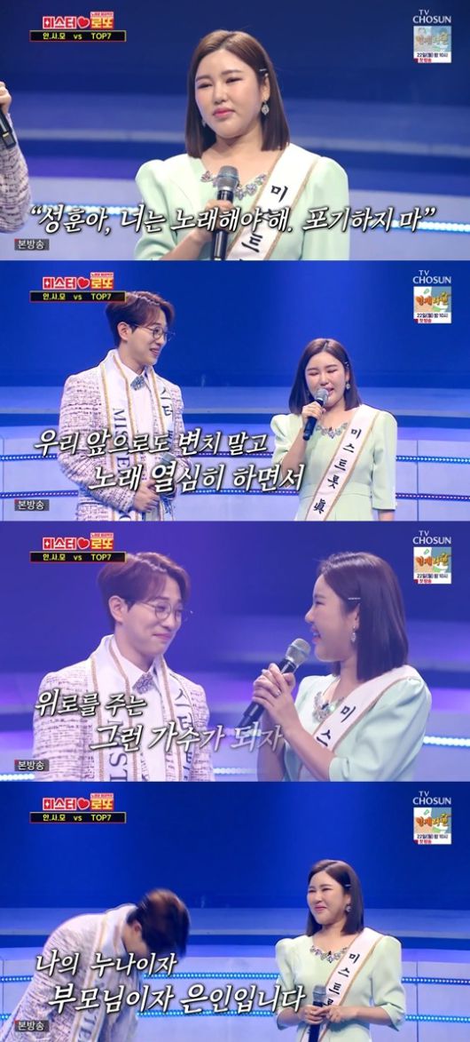 안성훈은 "누나랑 저는 2012년부터 함께 고생한 사이다. 누나가 제 화장을 해 주고, 저는 누나의 짐을 들어주곤 했다" 며 과거의 고생을 회상했다. 그는 "우리 꼭 나중에 성공해서 같은 무대에서 노래하자, 했었는데 오늘 이루게 됐다" 며 감격스러워했다.