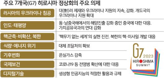 G7 정상들은 AI의 적절한 활용에 대해서도 의견을 나눈다. 지난달 29∼30일 열린 G7 디지털·기술장관 회의에서는 챗GPT 등 생성형 AI에 대한 대응이 논의됐다. 전염병 대응, 온실가스 감축을 핵심으로 하는 기후변화 등도 주요 의제로 꼽힌다.