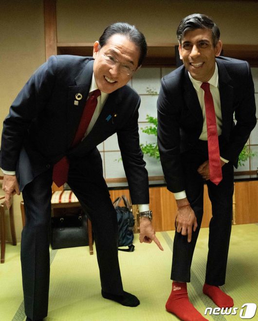 18일 산케이신문 등에 따르면 수낵 총리는 기시다 후미오 총리와의 저녁 식사 자리(워킹디너)에서 "이 양말 괜찮죠?"라며 바짓단을 들어 보였다.