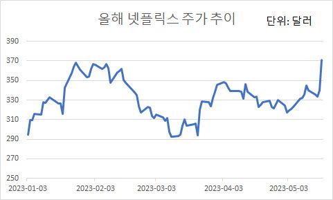 현지시간으로 18일 뉴욕증권거래소(NYSE)에 따르면 넷플릭스 주가는 전거래일 대비 9.22% 상승한 371.29달러에 거래를 마쳤다. 올해 들어 가장 큰 폭의 상승률을 보이며 강한 반등세를 보였다.