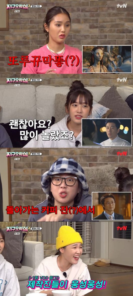 숙소에서 잠시 쉬는 시간을 보낸 ‘지구오락실2’ 멤버들의 첫 번째 미션은 저녁을 건 게임이었다. 이은지와 안유진, 미미와 이영지가 팀이 돼 드라마와 영화 명대사를 맞히는 퀴즈를 진행하게 됐다. 이은지는 ‘콘텐츠 괴물’이라는 수식어답게 보여주는 장면마다 빠르게 명대사를 맞히며 팀의 승리를 이끌었다.