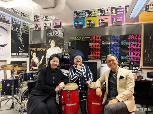 ‘재즈 대모’ 윤희정에게 노래 실력과 관계없이 삶의 히스토리를 그대로 전달해 사람의 감정을 파고드는 재즈의 묘미를 알게 해준 깐부들. 윤희정의 서울 서초동 연습실에서 포즈를 취한 안미려 회장, 윤희정, 변연배 대표(왼쪽부터). 유재영 기자 elegant@donga.com |
