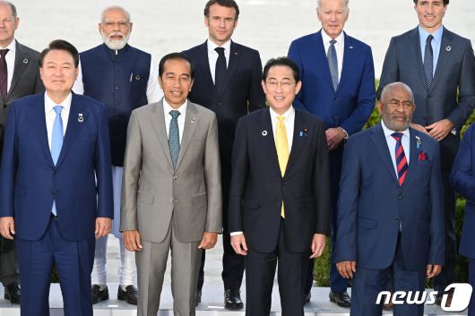 (서울=뉴스1) = G7 의장국인 일본 초청에 따른 참관국(옵서버) 자격으로 G7 정상회의에 참석한 윤석열 대통령이 20일 일본 히로시마 그랜드 프린스 호텔에서 주요 7개국 정상 등과 기념촬영을 하고 있다. (G7 2023 히로시마 서밋 제공) 2023.5.20/뉴스1
