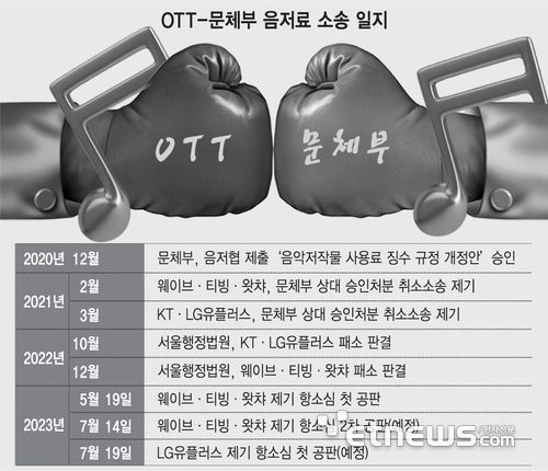 2021년 웨이브, 티빙, 왓챠 등 OTT 3사와 LG유플러스, KT 등 통신 2사는 각각 문체부 상대 한국음악저작권협회 음악저작물 사용료 징수규정 개정 승인처분 취소소송을 제기했다.