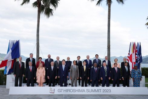 G7 의장국인 일본 초청에 따른 참관국(옵서버) 자격으로 G7 정상회의 참석한 윤석열 대통령이 20일 일본 히로시마 그랜드프린스호텔에서 열린 G7 정상회의에서 각국 정상들과 기념촬영을 하고 있다.(사진=연합뉴스) |