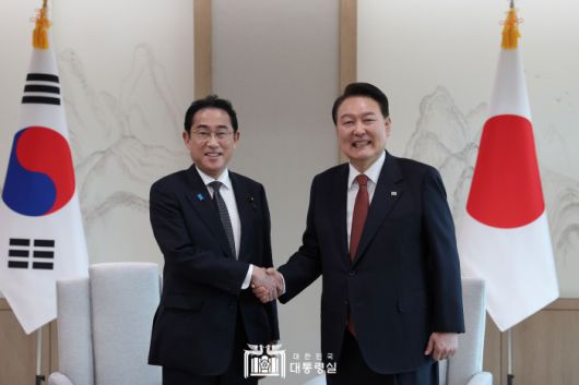 윤석열 대통령이 지난 7일 서울 용산 대통령실 청사에서 열린 소인수 회담에서 기시다 후미오 일본 총리와 악수하고 있다. [사진=대통령실] 2023.05.07 photo@newspim.com |