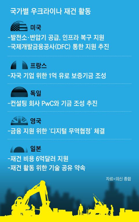 전쟁 중에도 이미 재건 사업에 나선 기업들도 있다. 프랑스 건설사 ‘마티에르’는 우크라이나에서 30개의 부교(浮橋)를 짓고, 농업 회사인 ‘마스 시즈’는 종자 사업을 하고 있다. 프랑스 정부는 자국 기업을 지원하기 위해 1억유로(약 1400억원)의 보증기금을 설립하기로 했다. 덴마크의 에너지 기업 단포스는 드론을 띄워 우크라이나에서 포격당한 지점들을 지도로 제작하고 있다. 뉴욕타임스는 “나중에 재건 사업을 할 때, 어떤 지역에 어떤 사업이 필요한지 미리 관련 데이터를 확보하는 것”이라고 분석했다.