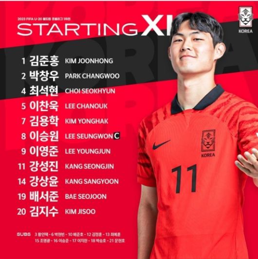 김은중 감독이 이끄는 대표팀은 골키퍼 김준홍을 시작으로 이찬욱과 김지수, 최석현, 그리고 배서준과 강상윤, 이승원, 박창우, 마지막으로 이영준과 강성진, 김용학이 선발 출전한다.