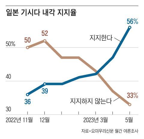 22일 요미우리신문이 발표한 5월 여론조사(20~21일 실시)에서 기시다 내각 지지율은 전달보다 9%포인트가 오른 56%를 기록했다. 작년 말만 해도 자민당과 구(舊) 통일교 간 유착 논란 탓에 지지율이 36%까지 떨어지며 ‘총리 조기 하차설’까지 나왔던 기시다 총리가 올해 들어 한·일 관계 개선, 우크라이나 현지 방문, G7 성공 개최 등 연이은 외교 성과를 통해 지지율 반등에 완벽하게 성공한 것이다. 이 신문은 “이번 지지율은 기시다 정권이 2021년 출범했을 때, 국민의 기대를 모았던 시기와 같은 수준”이라며 “자민당 내부에서 기시다 총리에게 조기 중의원 해산을 요구하는 목소리가 커지고 있다”고 보도했다. 자민당은 총 의석수 465석인 중의원에서 과반이 조금 넘는 262석(56%)를 차지하고 있다. 해산하면 의석수를 늘릴 수 있다는 자신감이 자민당 내 팽배한 것이다.
