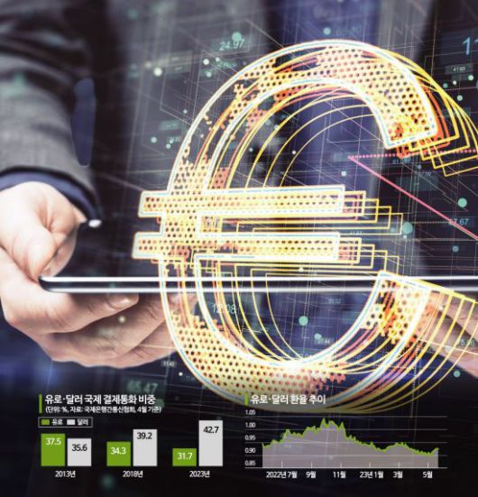 23일 세계 은행간 송금망인 국제은행간통신협회(SWIFT)에 따르면 지난달 유로의 국제 결제통화 비중은 31.7%를 기록했다. 1위인 달러 다음으로 높지만 그 비중은 점차 줄어들고 있다. 국제 결제통화 시장에서 유로 비중은 2013년 37.5%, 2018년 34.3%에서 올해 31%대로 하락했다(4월 기준). 같은 기간 달러 비중은 35.6%, 39.2%에서 지난달 42.7%로 상승세다. 이로 인한 달러와 유로의 결제 비중 차이도 10년 전 1.9%포인트에서 현재 11%포인트로 확대됐다.