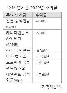 2022년 5대 글로벌 연기금 수익률은 일본 공적연금(GPIF) -4.8%, 캐나다연금투자위원회(CPPIB) -5.0%, 한국 국민연금 -8.3, 미국 캘퍼스 -11.2%, 노르웨이 국부펀드(GPFG) -14.1%, 네덜란드 공적연금(ABP) -17.6%를 기록했다.