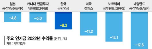 하지만 투자시장 위축에 따라 주요 글로벌 연기금 모두 마이너스를 기록한 점을 감안하면 선방했다는 평가다. 미국, 노르웨이, 네덜란드 연기금은 지난해 마이너스 두자릿수를 기록한 반면 국민연금은 -8.3%에 그쳤다.