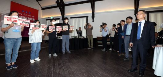 [서울=뉴시스] 조성봉 기자= 23일 서울 중구 정동1928아트센터에서 열린 상생임금위원회 토론회에서 이정식 고용노동부 장관이 기습시위 하는 비정규직노동자들을 바라보고 있다. |
