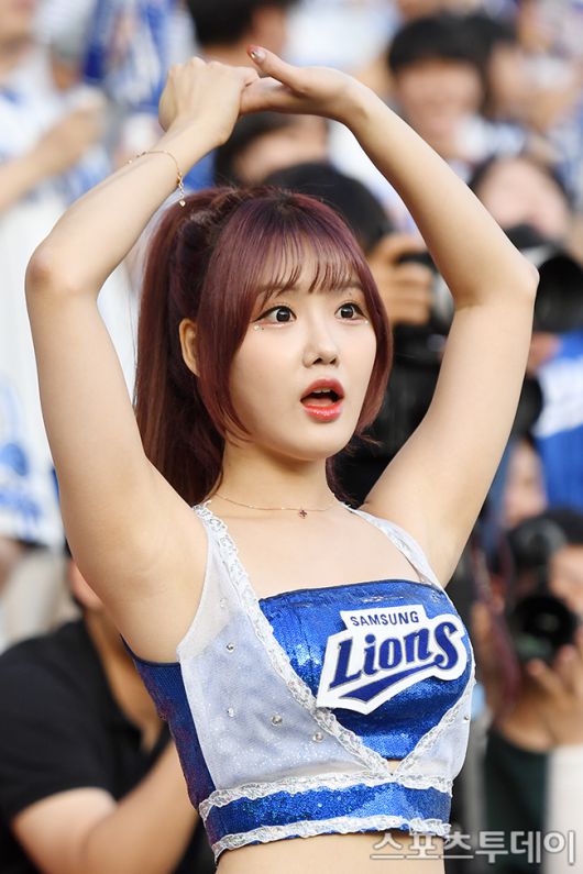 [스포츠투데이(잠실)= 권광일 기자] 2023 신한은행 SOL KBO리그 삼성 라이온즈와 두산 베어스 경기가 23일 오후 서울 잠실야구장에서 열렸다. 치어리더 고정현이 응원을 하고 있다. 2023.05.23. [스포츠투데이 권광일 기자 sports@stoo.com]