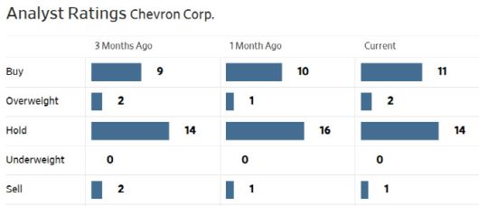 한편 셰브론에 대해 투자의견을 제시한 월가 애널리스트는 총 28명으로 이중 13명(46.4%)은 매수(비중확대 및 시장수익률 상회) 의견을 유지하고 있다. 평균 목표주가는 188.09달러로 이날 종가보다 20% 높다.