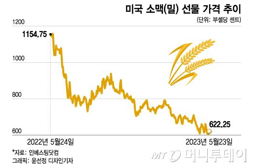 인베스팅닷컴에 따르면 오후 2시50분(한국 시각) 기준 미국 소맥 선물 가격은 1부셸당 약 6.22달러를 보이고 있다. 지난해 5월24일에는 장 중 1부셸당 12.09달러 가량까지 오르기도 했다.