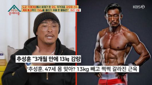 추성훈은 계체를 위해 감량을 진행하다가 마비 증세가 왔다는 이야기를 털어놨다. 지난해 아오키 신야와의 대결을 앞두고 3개월 만에 13kg을 감량한 그는 “많이 긴장한 상태에서 계체를 통과하고 긴장이 풀렸다. 수분 공급부터 해야 해서 방에 미리 음식을 준비해놨다. 하지만 방에 들어가서 문을 닫자마자 쓰러졌다”라고 밝혀 안타까움을 안겼다.