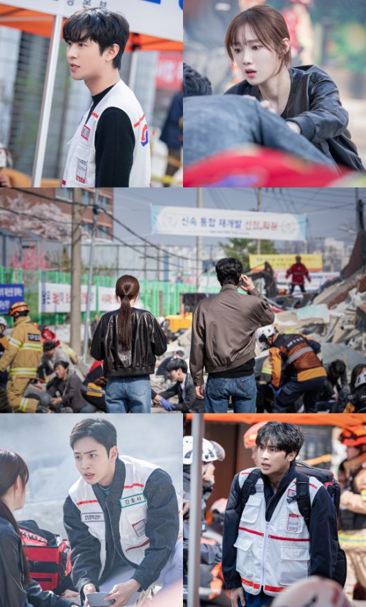 공개된 사진 속 건물 붕괴 장소에 도착한 서우진과 차은재는 눈 앞에 펼쳐진 참담한 현장을 바라보고 있다. 처참하게 무너진 건물과 다친 채 빠져나온 사람들의 모습도 보인다. 한쪽에서는 구급대원들이 구조를 진행 중인, 그야말로 아비규환의 상황. 급하게 현장에 온 듯 사복을 입고 있는 서우진, 차은재는 빠르게 상황을 파악하고 있다.
